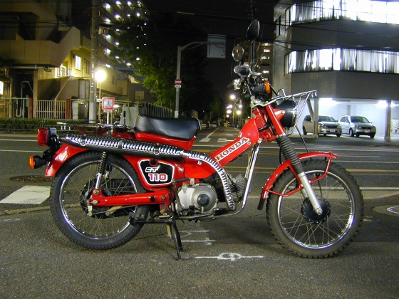 このCT110は、トレッキングバイクの入門モデルとしてホンダが開発、自然の雰囲気を楽しみながらゆったりと走行することはもとより、ツーリングや市街地走行など、幅広い用途に応えられる 機能美を持つ新感覚の、レジャーバイクである